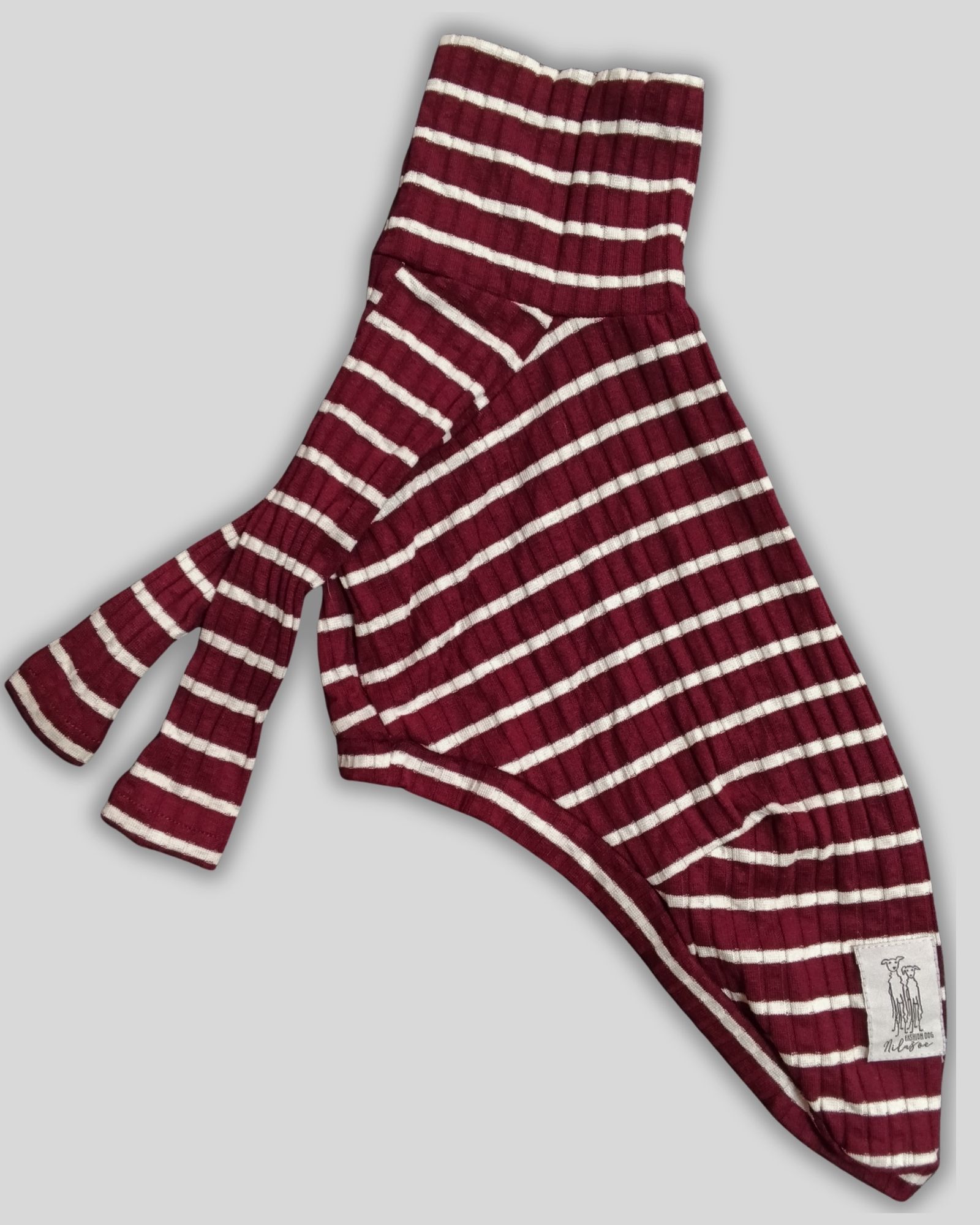 Confeccionada em malha canelada macia, o tecido possui textura delicada e leve elasticidade, garantindo um caimento confortável e adaptável ao corpo do galgo.
