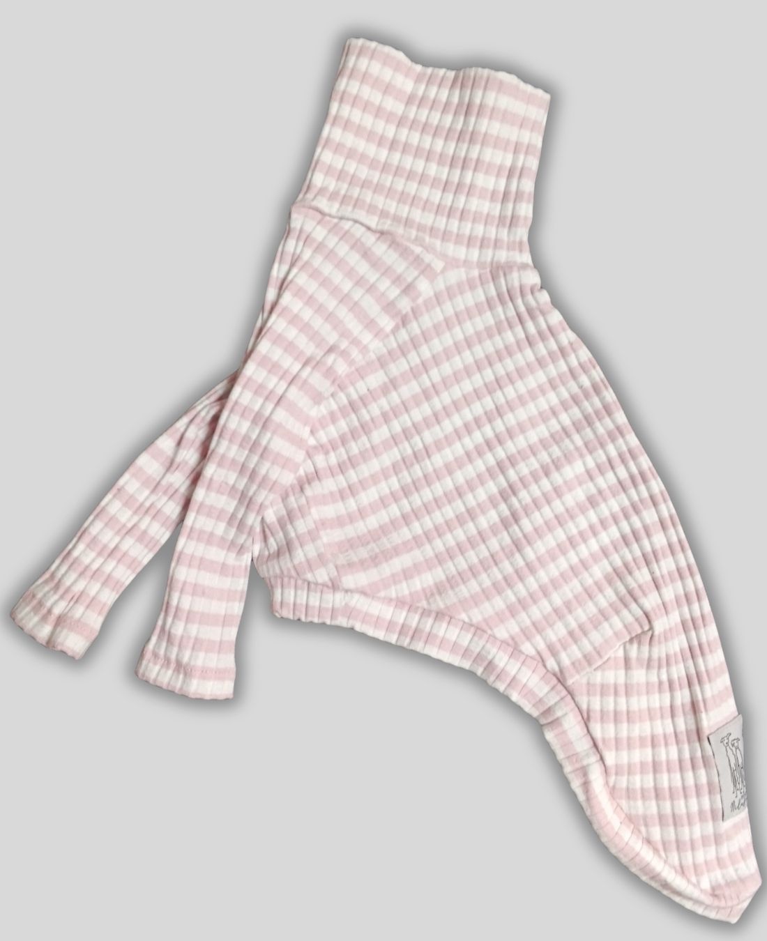 A malha canelada oferece melhor adaptação ao corpo devido à sua estrutura vertical, proporcionando conforto com leve compressão natural. As listras fazem parte da construção do tecido, mantendo a maciez da peça.