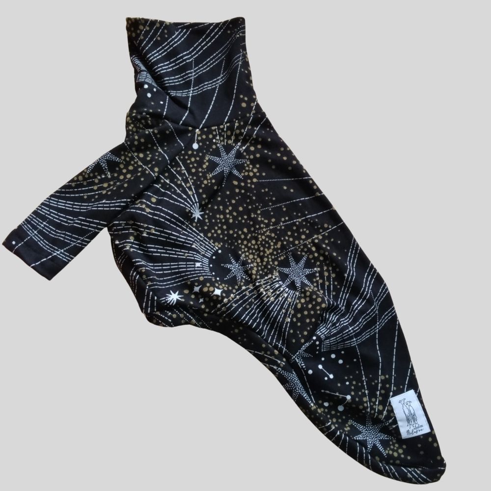 A Camiseta de Galgo Ano Novo Preta Estrela Branca e Poá Dourado da Nilazoe foi criada para vestir seu galguinho com o brilho misterioso e encantado da virada do ano.
