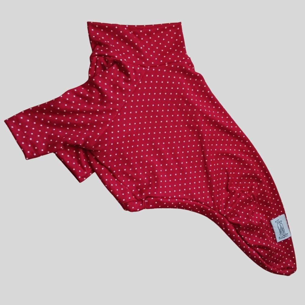 A Camiseta de Galgo Natal Vermelho Poá Branco foi criada para envolver seu magrelinho na doçura e na magia do Natal. Confeccionada em suede macio e aveludado, ela oferece um toque suave como carinho de fim de tarde, abraçando o corpo delicado do galgo com conforto e leveza.