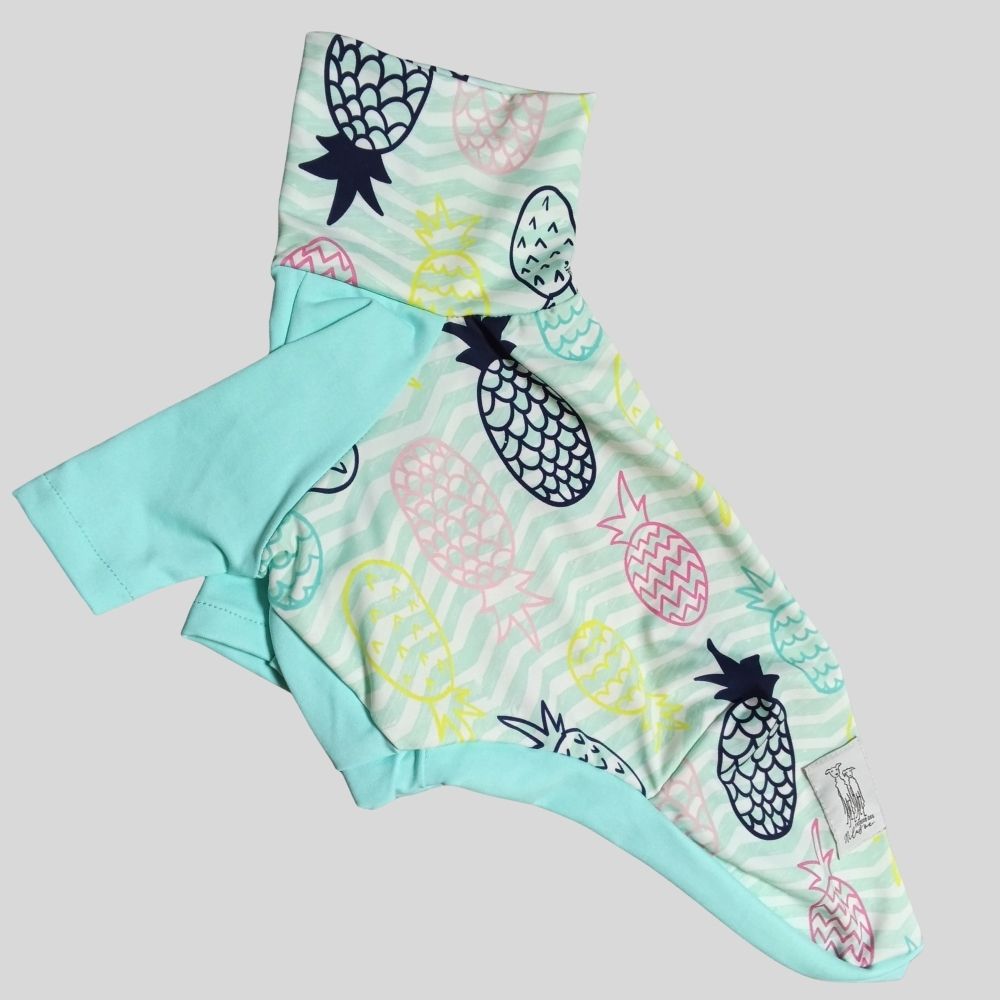 Leve como uma brisa de verão e cheia de frescor, a Camiseta de Galgo UV Abacaxi Verde Claro foi criada para vestir o galgo com suavidade, proteção e alegria. As costas e a gola em branco e verde-água, com estampa delicada de abacaxis, evocam dias ensolarados e tranquilos, enquanto as patas e o peito em verde claro trazem harmonia e equilíbrio ao visual.
