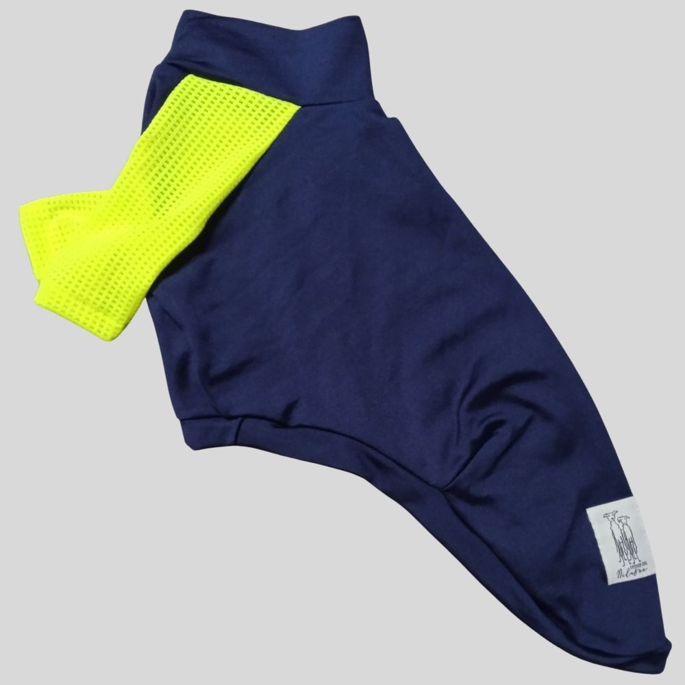 O tom marinho envolve o corpo com elegância e segurança, enquanto o amarelo neon nas patas traz energia, visibilidade e frescor — como um raio de sol que não esquenta, apenas cuida.