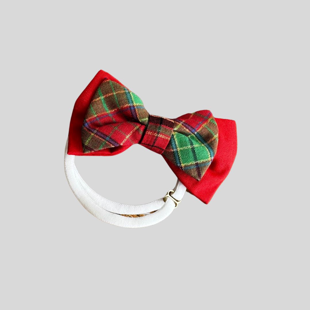 GRAVATA DE GALGO BORBOLETA DUPLA VERMELHO E XADREX VERDE PE. Pode ser ajustado com o elastico que tambem é de algodão bem macio que nao ira machucar o pescoço.