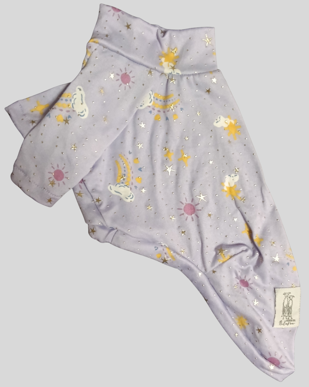 O charme da peça está no tom lilás delicado, combinado com desenhos de sol e nuvens, além da textura sutil de estrelas douradas, que trazem um brilho discreto e um visual encantador.