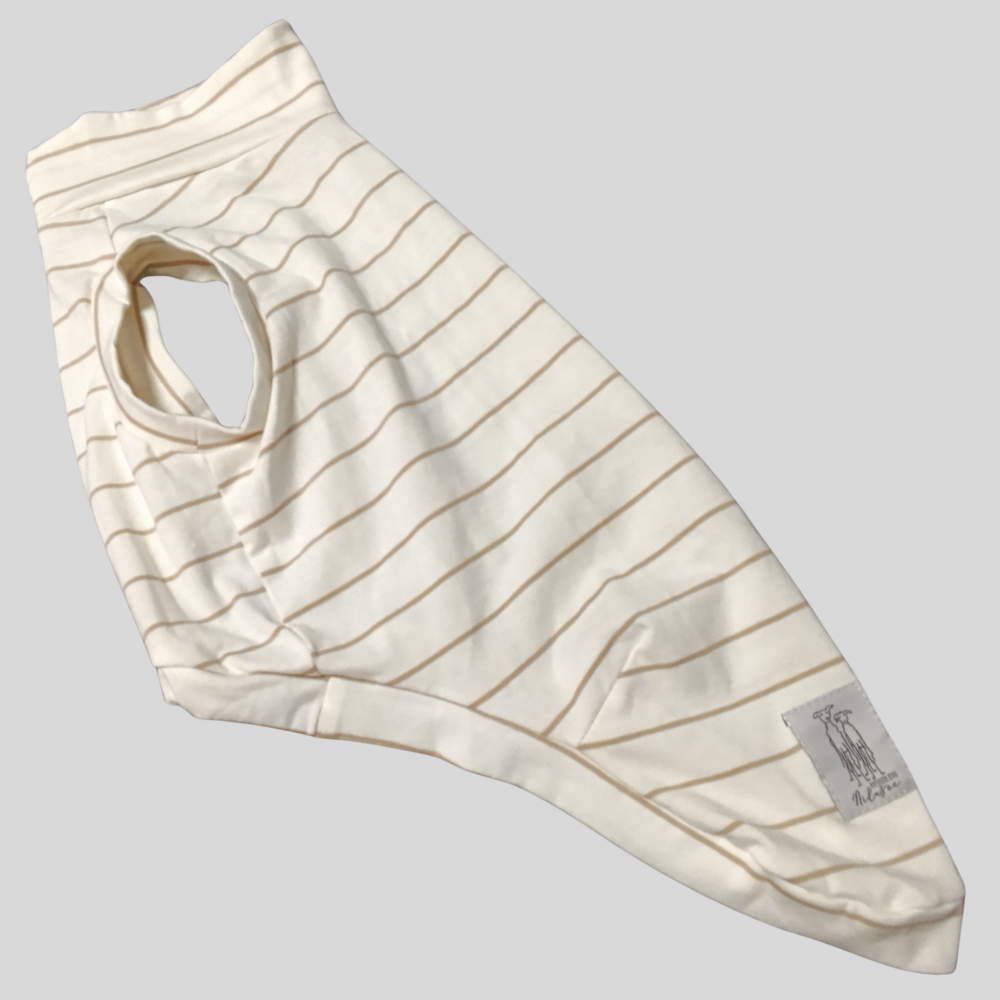A Regata de Galgo Algody Polo Creme Line Bege Gola Baixa traduz elegância tranquila e conforto natural em cada detalhe. O design em faixas suaves de creme e bege cria um visual atemporal, delicado e sofisticado, perfeito para quem ama peças neutras que valorizam a anatomia única do galgo.