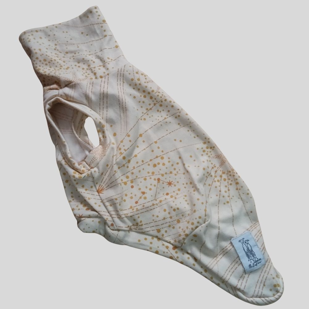A Regata de Galgo Ano Novo Bege Estrela Laranja e Poá Dourado da Nilazoe foi criada para vestir seu galguinho com o brilho misterioso e encantado da virada do ano.