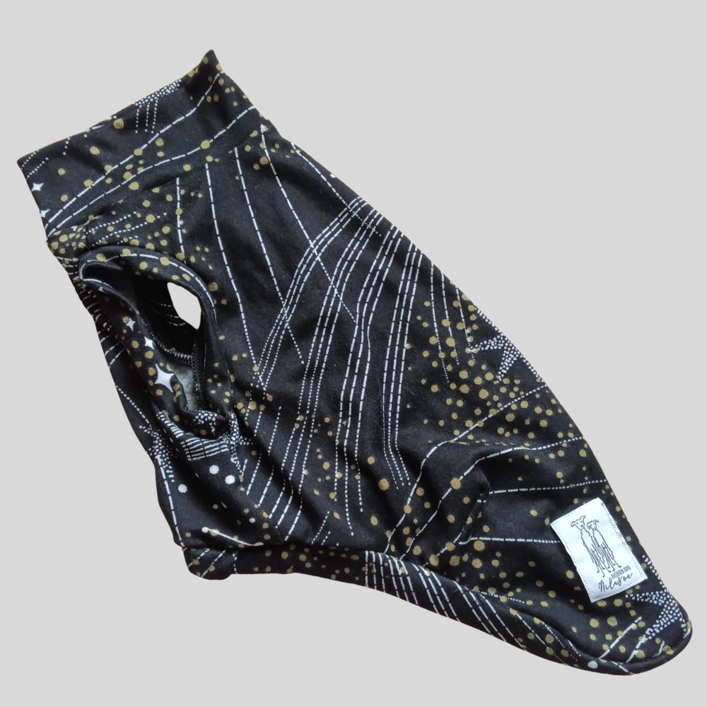 A Regata de Galgo Ano Novo Preta Estrela Branca e Poá Dourado da Nilazoe foi criada para vestir seu galguinho com o brilho misterioso e encantado da virada do ano.