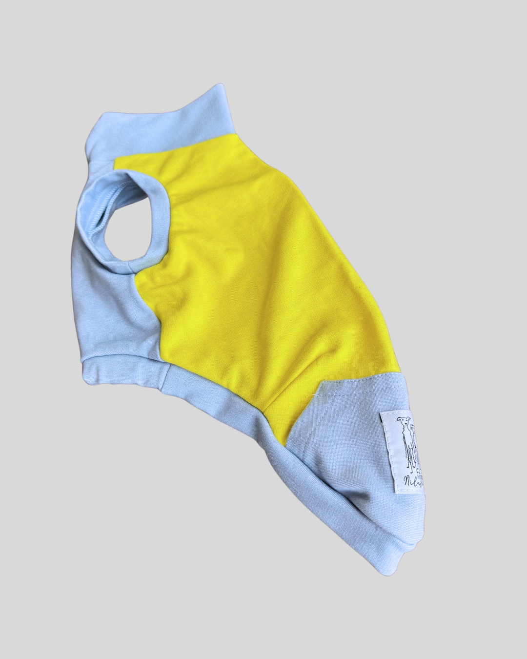 A Regata de Galgo Densy Amarela e Azul Pocket é uma peça cheia de alegria, conforto e estilo para galgos que encantam por onde passam. O contraste harmonioso entre o amarelo vibrante nas costas e o azul claro na frente cria um visual leve, moderno e acolhedor.