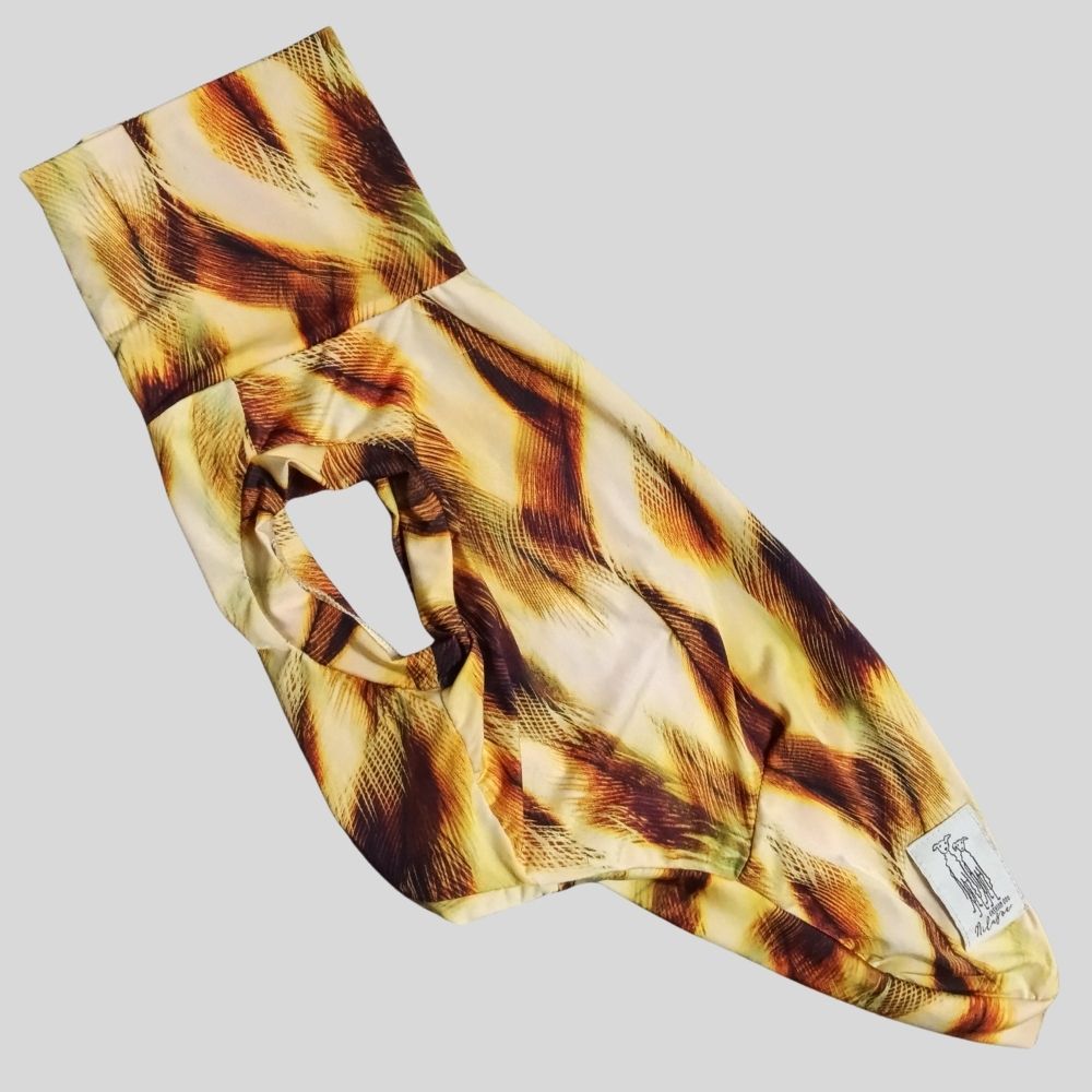 A Regata de Galgo UV Animal nasce da união entre estilo selvagem e cuidado delicado. Sua estampa marcante veste o corpo do galgo como uma segunda pele, enquanto o tecido UV de poliamida bem fininho permite que o ar circule livremente, mantendo o conforto mesmo sob o sol.