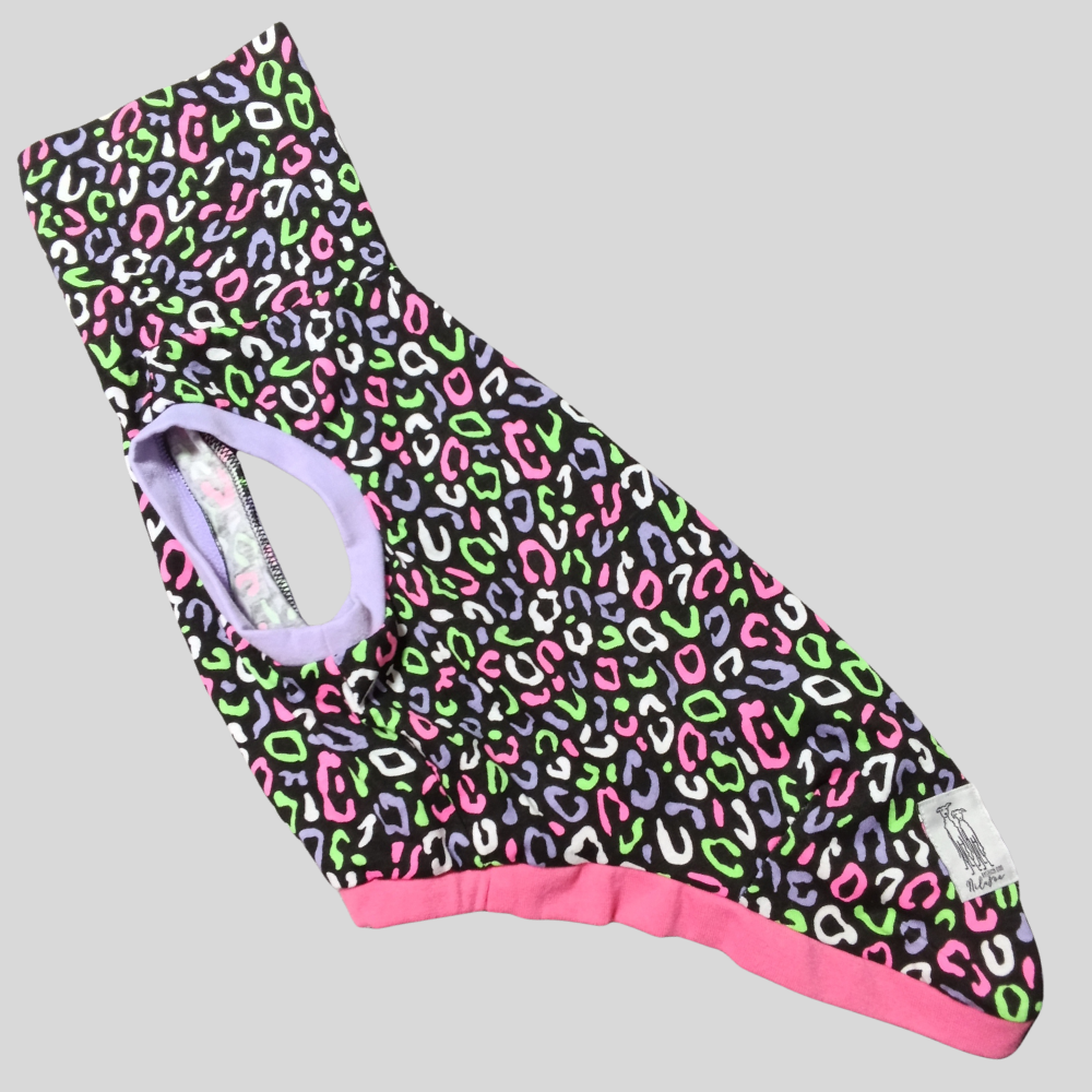 A Regata de Galgo Oncinha Colorida nasceu para galgos que carregam personalidade no olhar e leveza no caminhar. A estampa de oncinha em cores suaves traduz liberdade, enquanto os punhos em lilás e rosa abraçam o corpo com delicadeza — sem apertar, sem aquecer demais.