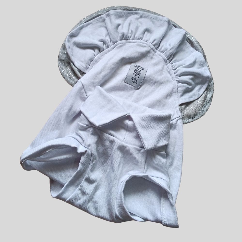 O corpo em malha de algodão branca envolve seu galgo como um abraço leve e macio, trazendo suavidade ao toque e total liberdade de movimento. A gola branca meio aberta, igualmente delicada, reforça a pureza e a serenidade que marcam esse momento especial.