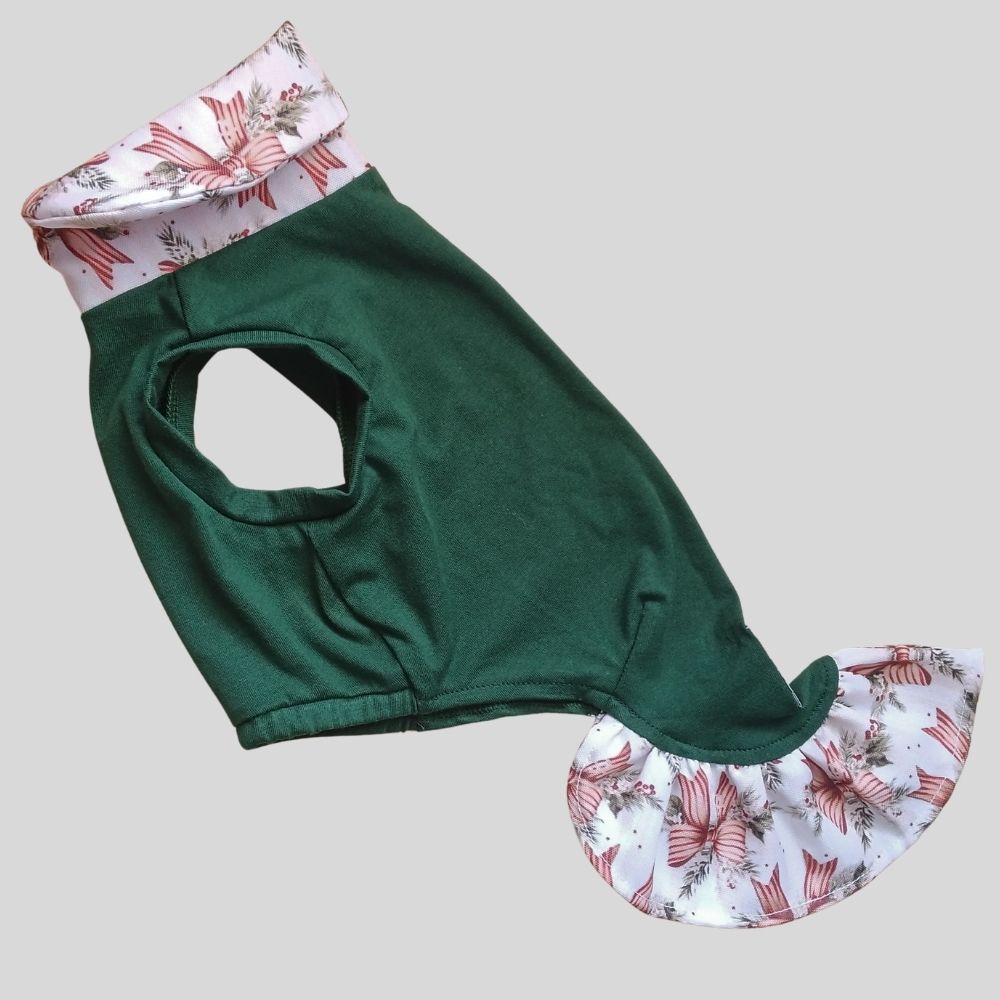 O Vestido de Galgo Natal Verde Laço foi criado para transformar o charme natural dos galgos em pura poesia natalina. Seu corpo em algodão verde traz a serenidade da noite de Natal, enquanto a gola e a saia em lurex cintilante, estampadas com delicados laços natalinos, capturam a magia das luzes e o brilho das celebrações.